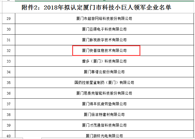 近日,快普獲“廈門(mén)市科技小巨人領(lǐng)軍企業(yè)”榮譽(yù)稱號(hào),這是繼2017年獲得廈門(mén)市科技小巨人企業(yè)后,再次榮膺領(lǐng)軍企業(yè)行列。