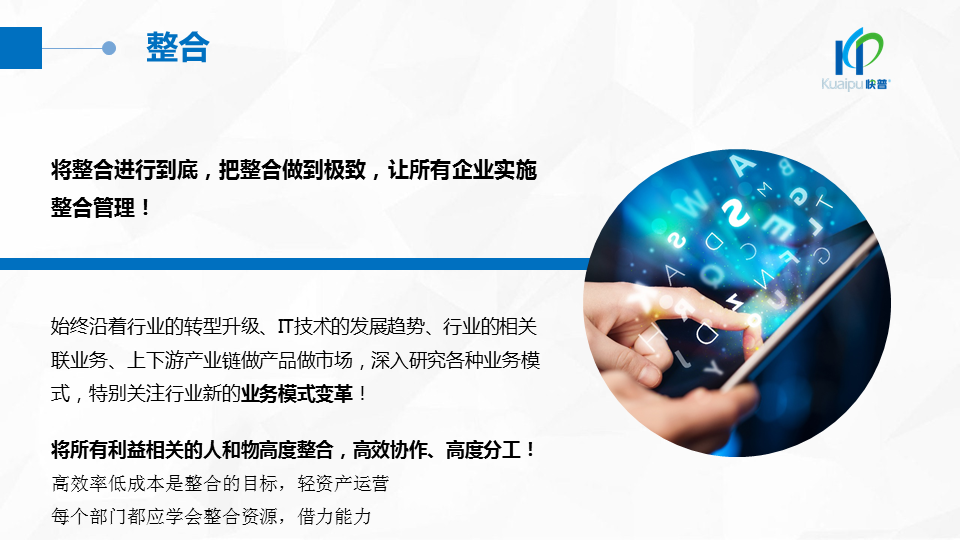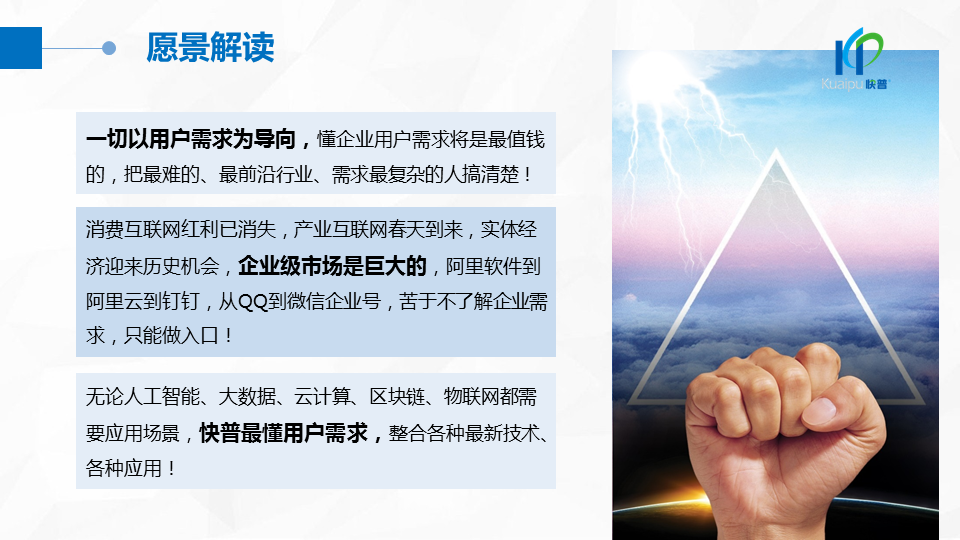 溫董在大會上指出:“成功的企業(yè)、成功的產(chǎn)品都在做符合人性的事!成功的個人都在挑戰(zhàn)人性弱點!作為中國企業(yè)信息化管理的服務商,我們應該充分理解人性定律,為客戶提供一切人性化的產(chǎn)品與服務,讓快普成為最懂企業(yè)用戶需求的中國企業(yè)!”