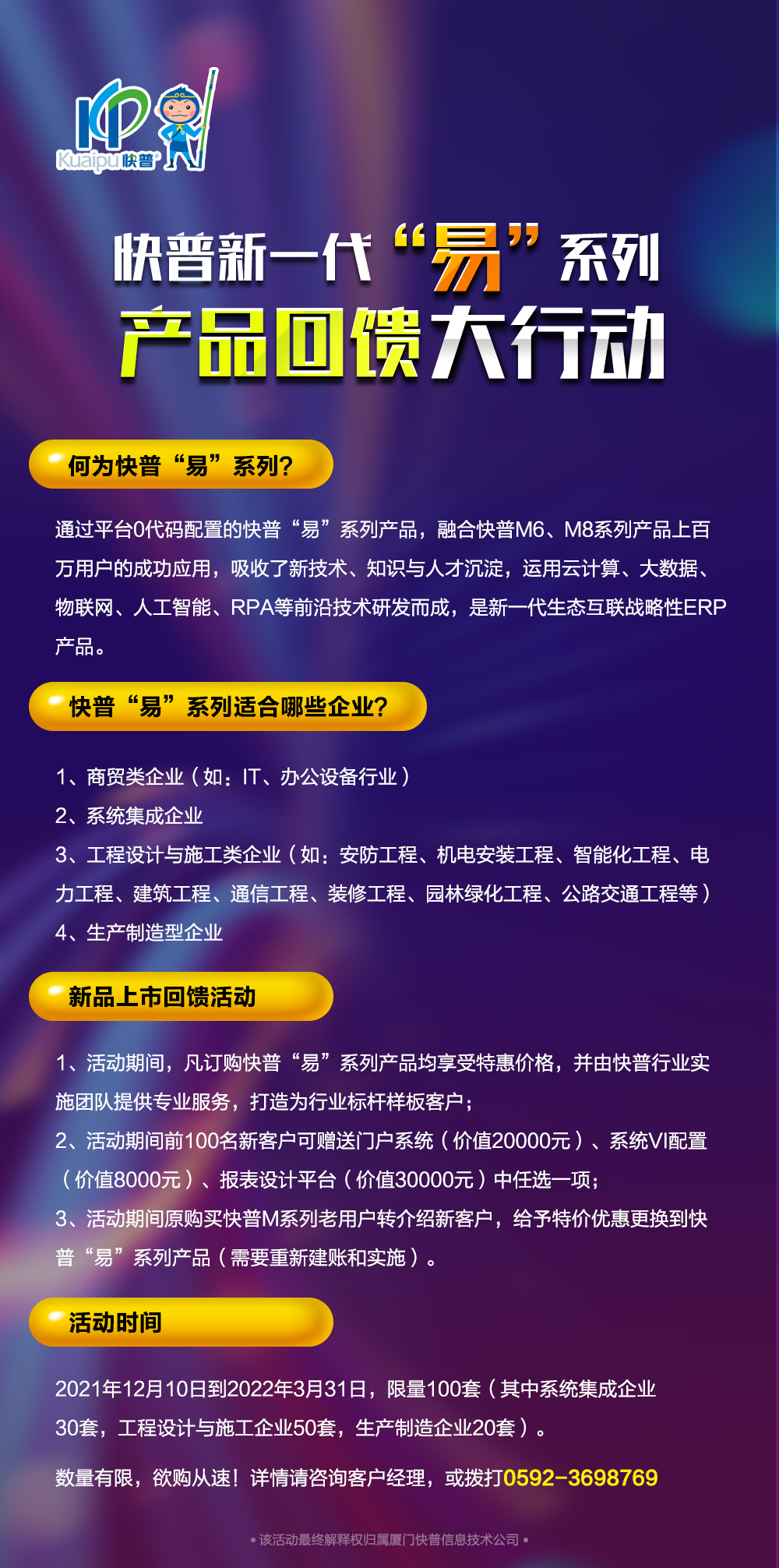 為了讓更多客戶搶先體驗快普“易”系列產(chǎn)品,現(xiàn)推出“限量優(yōu)惠回饋大行動”。希望借助本次活動幫助更多企業(yè)在新財年實現(xiàn)管理升級、業(yè)務(wù)轉(zhuǎn)型;在別人觀望等待時,變“危機(jī)”為機(jī)會,在應(yīng)對競爭格局中尋求突破,取得又好又快的發(fā)展。