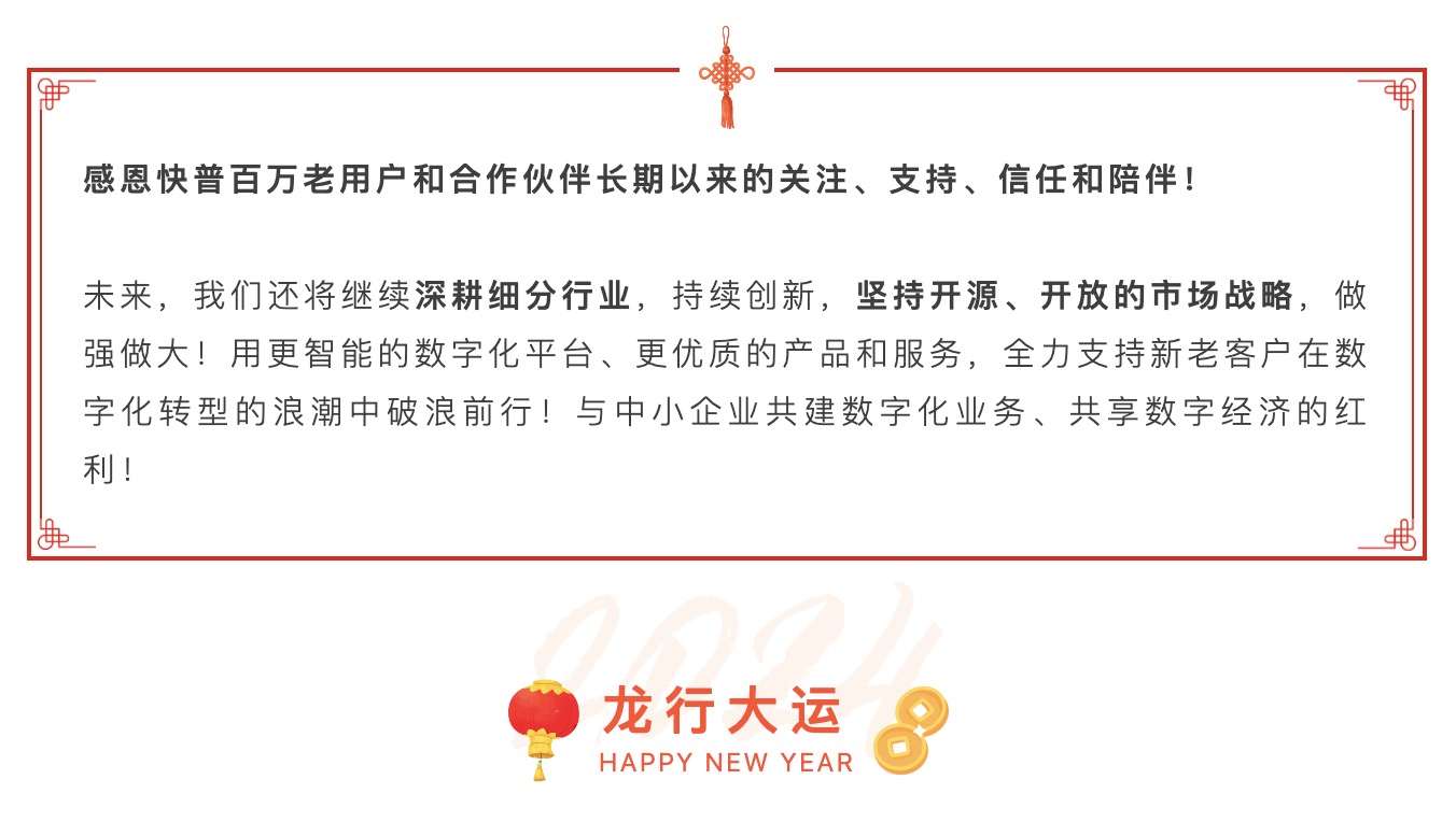 2023年是快普銳意改革、開拓進取的一年。面對機遇和挑戰(zhàn),我們苦練內功,加大研發(fā)投入,積極擁抱市場,通過新一代“易”系列產品,幫助大量企業(yè)成功實現(xiàn)數(shù)字化的轉型升級,賦能企業(yè)邁向高質量發(fā)展!同時,快普也實現(xiàn)了自身的逆勢增長,多項科技創(chuàng)新成果獲得了政府的嘉獎與社會各界的好評!2024年,我們不忘初心,堅守“數(shù)字化平臺服務商”的使命,1月份再創(chuàng)多項佳績!