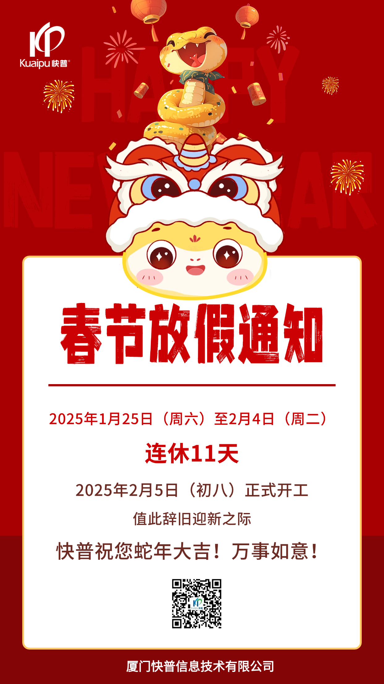 2025年春節(jié)即將到來,快普公司全體員工提前恭??炱沼脩粼谛碌囊荒昀?,生活美美滿滿,事業(yè)紅紅火火,財源滾滾而來,家庭和和美美,幸福永遠(yuǎn)常在。
