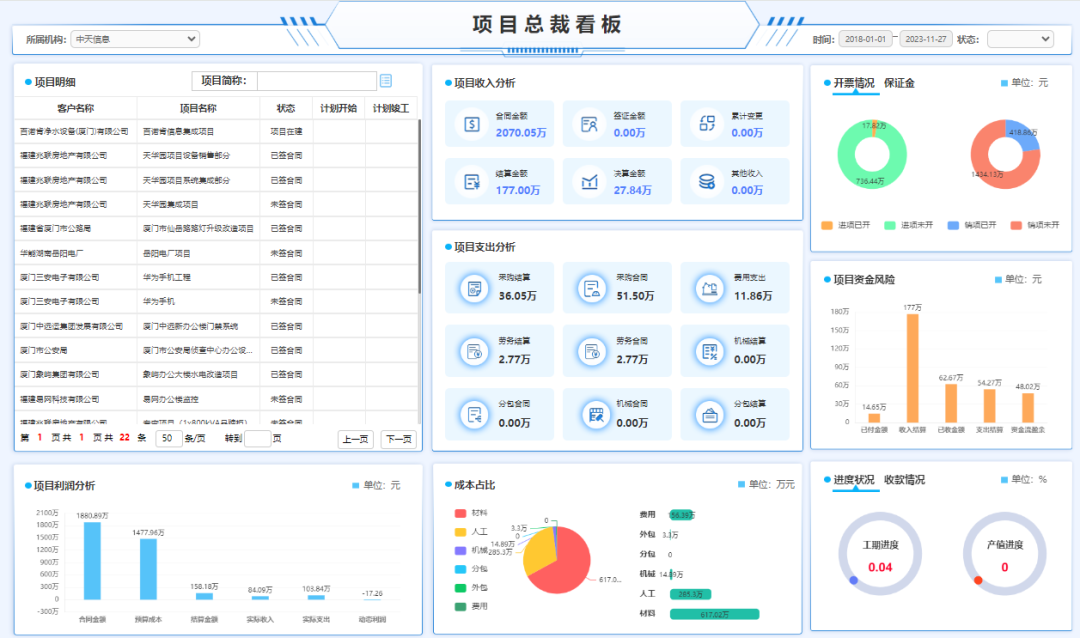 1、智慧決策體系:構(gòu)建涵蓋項(xiàng)目毛利率、質(zhì)保金狀態(tài)等項(xiàng)目關(guān)鍵指標(biāo)的多維度數(shù)據(jù)看板,支持管理層與執(zhí)行層分級透視。