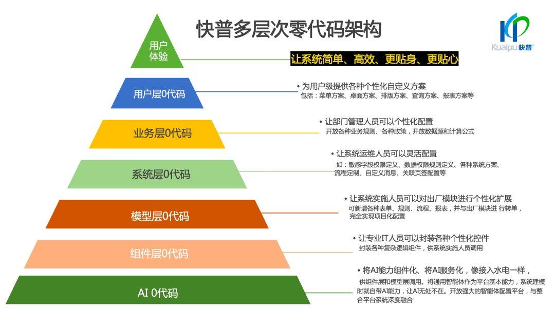 針對這一核心問題,溫董詳細闡釋了快普獨創(chuàng)的 “多層次零代碼架構(gòu)” 如何助力企業(yè)實現(xiàn)“小快輕準”轉(zhuǎn)型: